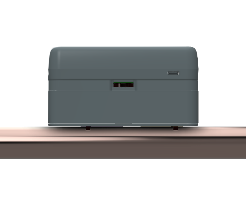 The water sensor clamp measures the flow and temperature in a water pipe using a "Time of Flight" measurement method and transmits the data wirelessly. Through an internal analysis of the flow, water leaks, and other anomalies are detected, and the owner is alerted. The device is clamped onto the outside of the water pipe without the need to interrupt the water supply. Its flexible design and innovative software allow it to be used on water pipes ranging from DN15 to DN40 (diameter 15…50 mm) with all available materials in the market, such as PEX, PEX AL, copper, PE, or steel. It meets all the requirements of the European Metering Directive (MID). With a footprint of only 60 mm above the water pipe and a length of 110 mm, the device is very slim and short, making it easy to install.
