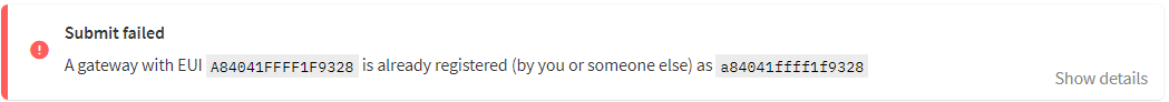“message”: “error:pkg/identityserver:gateway_eui_taken (a gateway with EUI A84041FFFF1F9328 is already registered (by you or someone else) as a84041ffff1f9328)”,