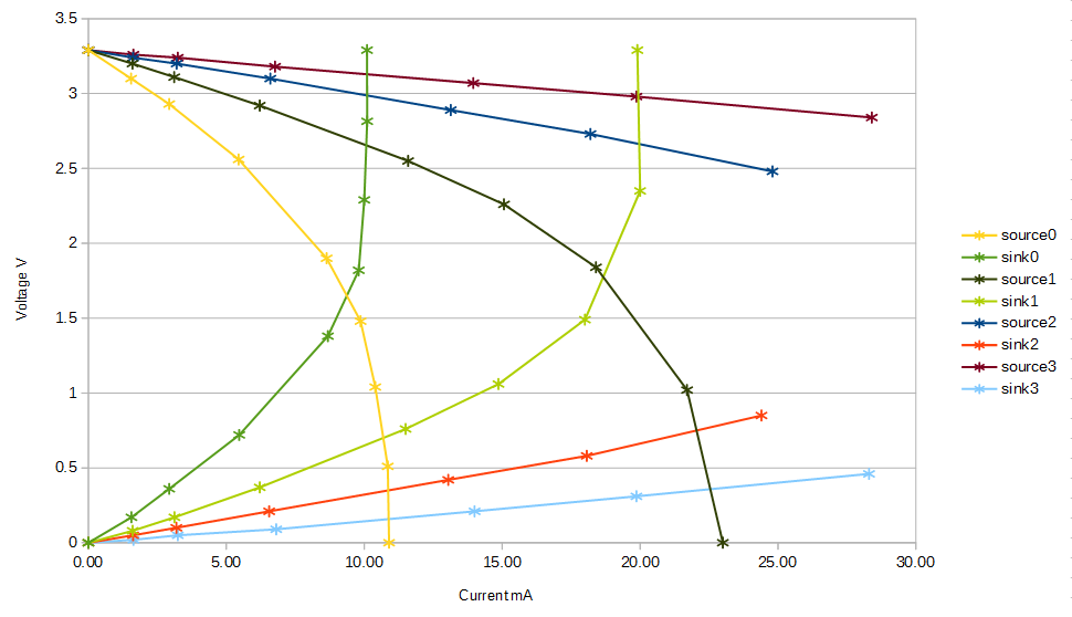 The measurements were made with the following resistances: infinite, 2kΩ, 1kΩ, 470Ω, 220Ω, 150Ω, 100Ω, 47Ω and 0Ω. But for strengths 2 and 3 the minimum resistance was 100Ω.