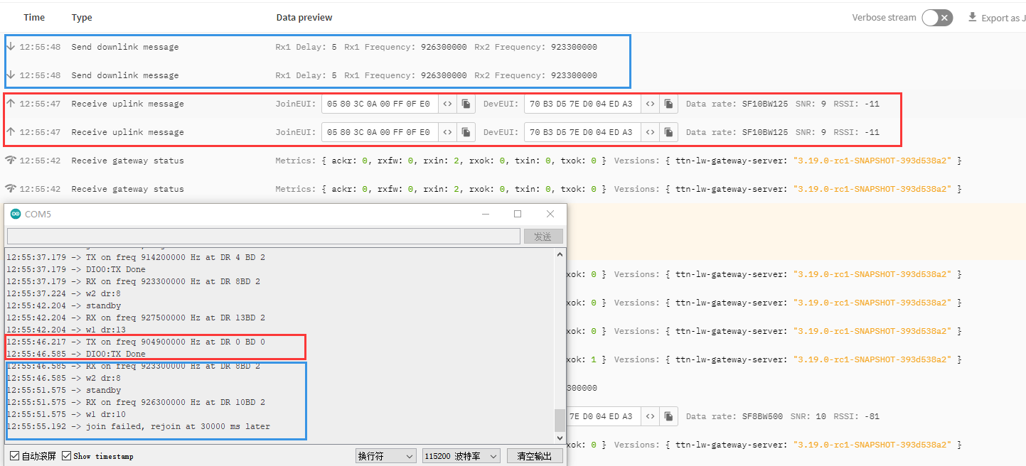 But my lora end node can’t receive this accept message so that it shows join failed in the com5.