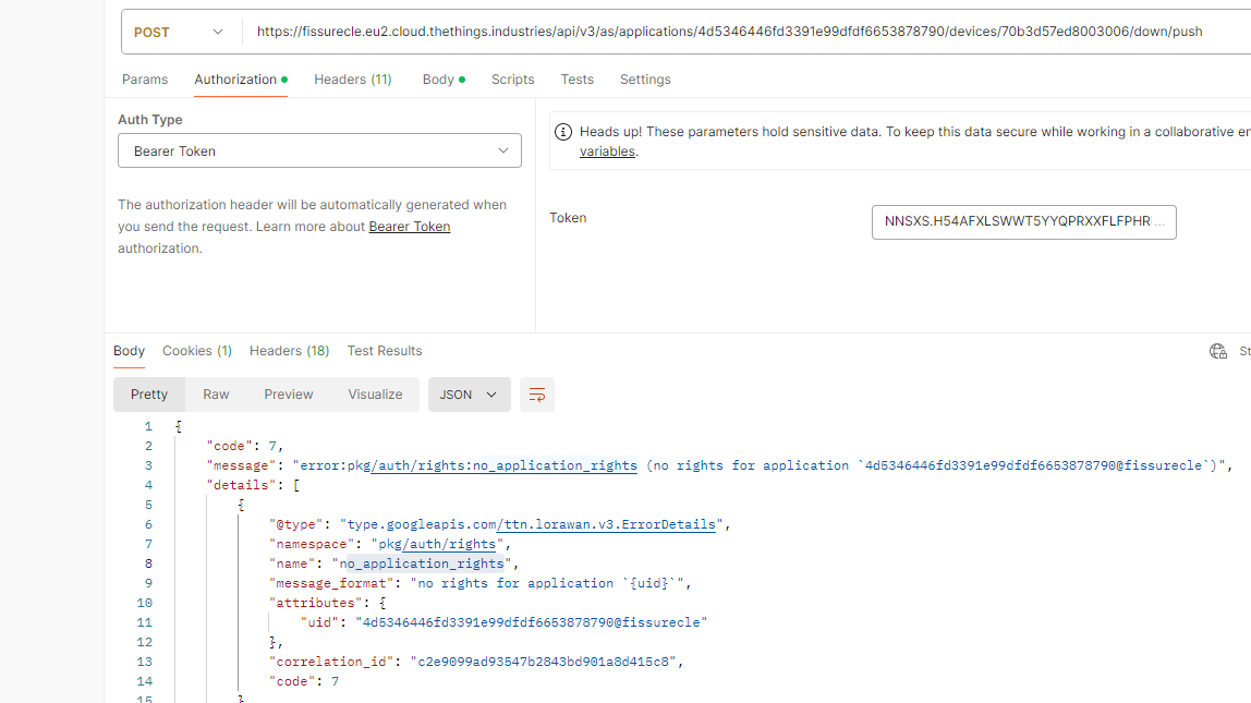 Your application & device ids look strange - like you are trying for some security by obfuscation which is a bit pointless with the security already provided and just makes understanding things when you come to debug issues like this.
