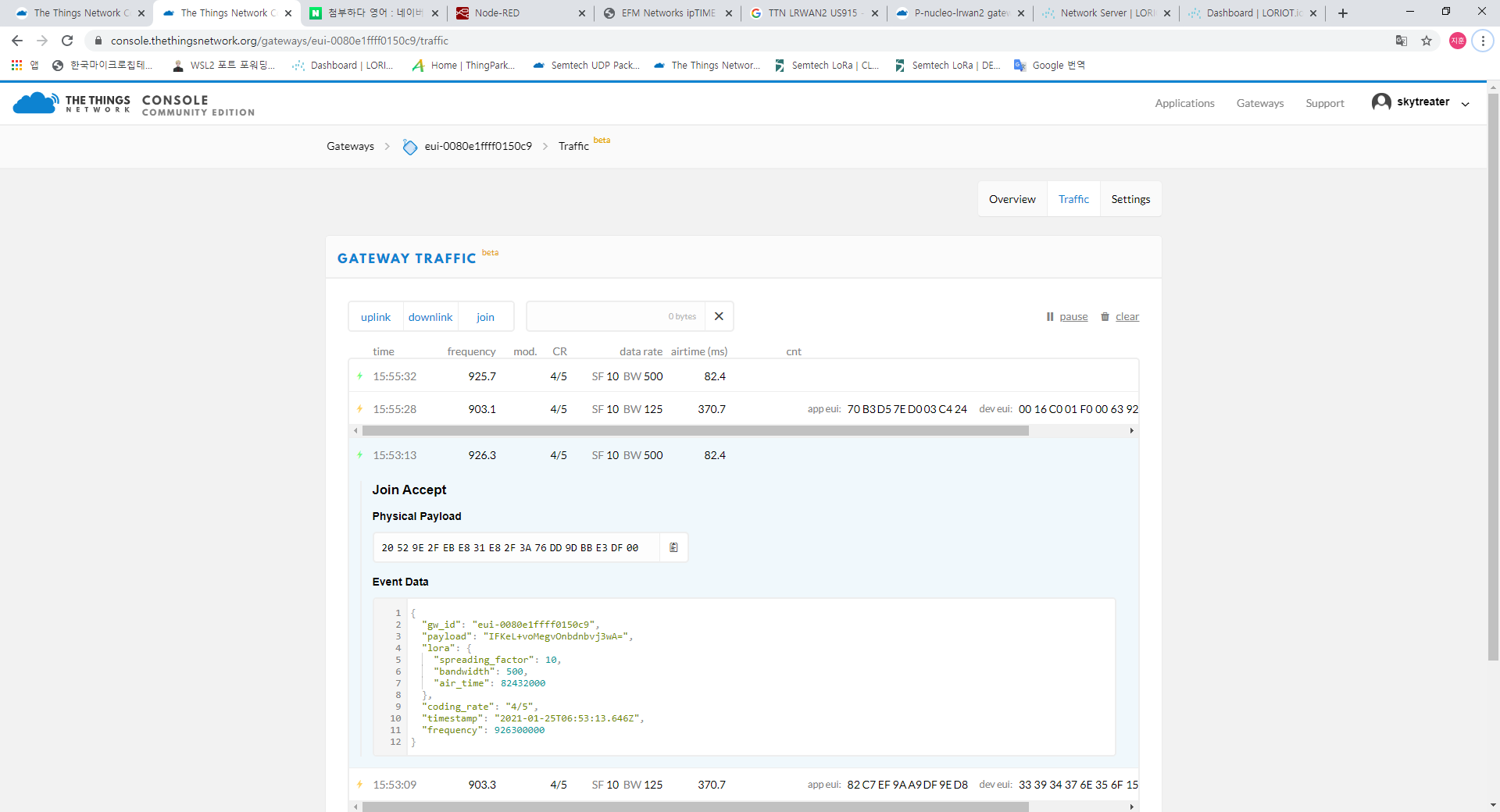 JUL: {"rxpk":[{"tmst":28614332,"chan":5,"rfch":1,"freq":903.300000,"stat":1,"modu":"LORA","datr":"SF10BW125","codr":"4/5","lsnr":-11.3,"rssi":-93,"size":23,"data":"ANie36ma78eCFW81bjc0OTNMYoZ6W1M="}]}