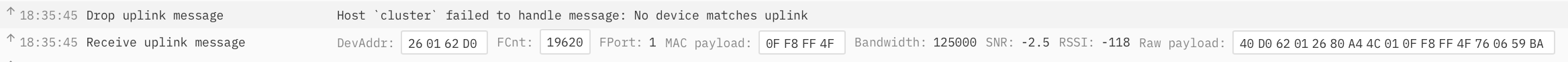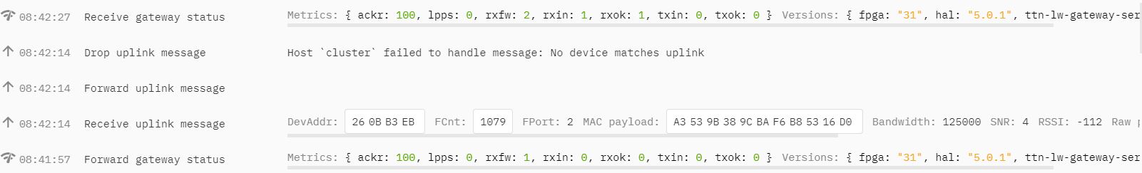 Thank you so much for the explanation. I just doubble checked my gateway Live data and End device Live data. Our gateway shows “Drop uplink message” with “Host cluster failed to handle message: No device matches uplink”.