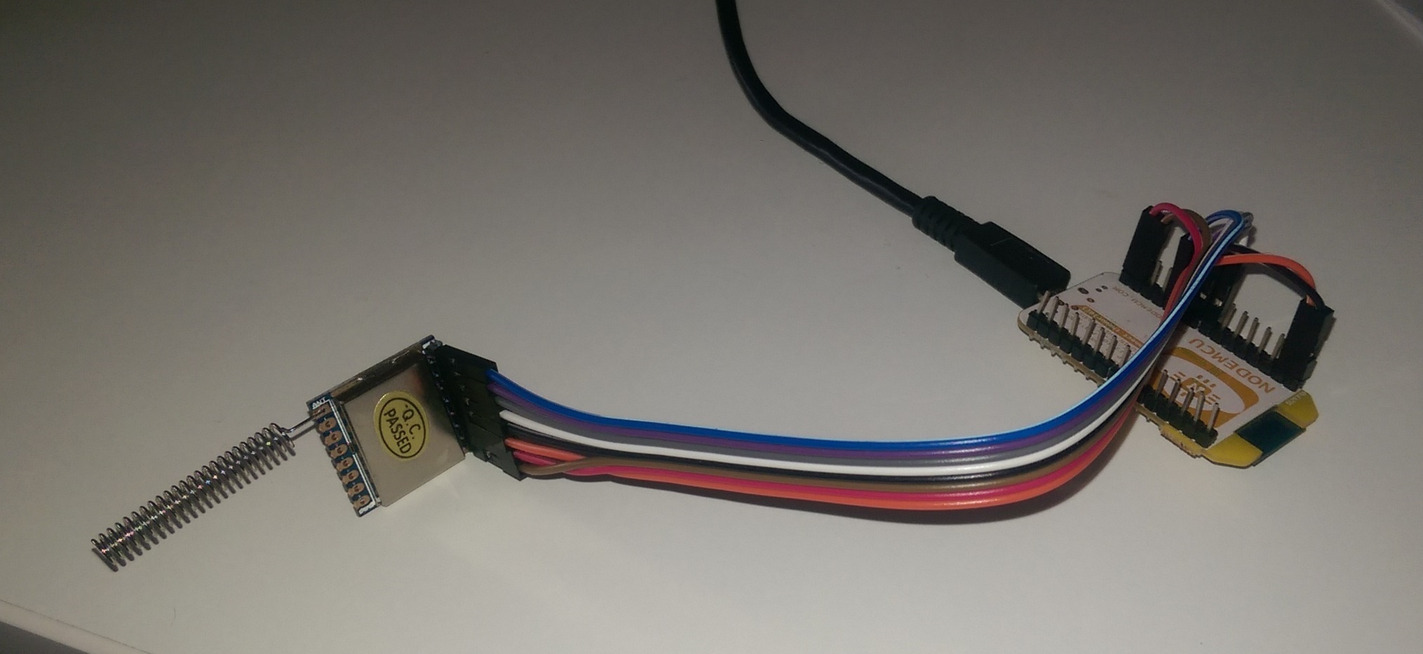Mmm, still no joy. Tried pulling out all the wires one by one. The gateway does seem to happily send the stats every 30 seconds, but it doesn’t start up after a power off/on without the wires plugged in correctly, and the same with the node which will only start up and get the “Event EV_TXCOMPLETE” after a send when the wires btw the SX1276 and ESp are correct. The only ones that don’t seem to matter are SX1276-REST to ESP/GPIO16 which can be left disconnected and SX1276-DIO2 to ESP/GPIO3 which i seem to have to leave disconnected or the ESP wont flash. Also tried swapping around which ESP/SX1276 is the gateway or node and either works the same. So given all that and that the node comes back “Event EV_TXCOMPLETE” when its wired up correctly it seems like the hardware is working ok?
