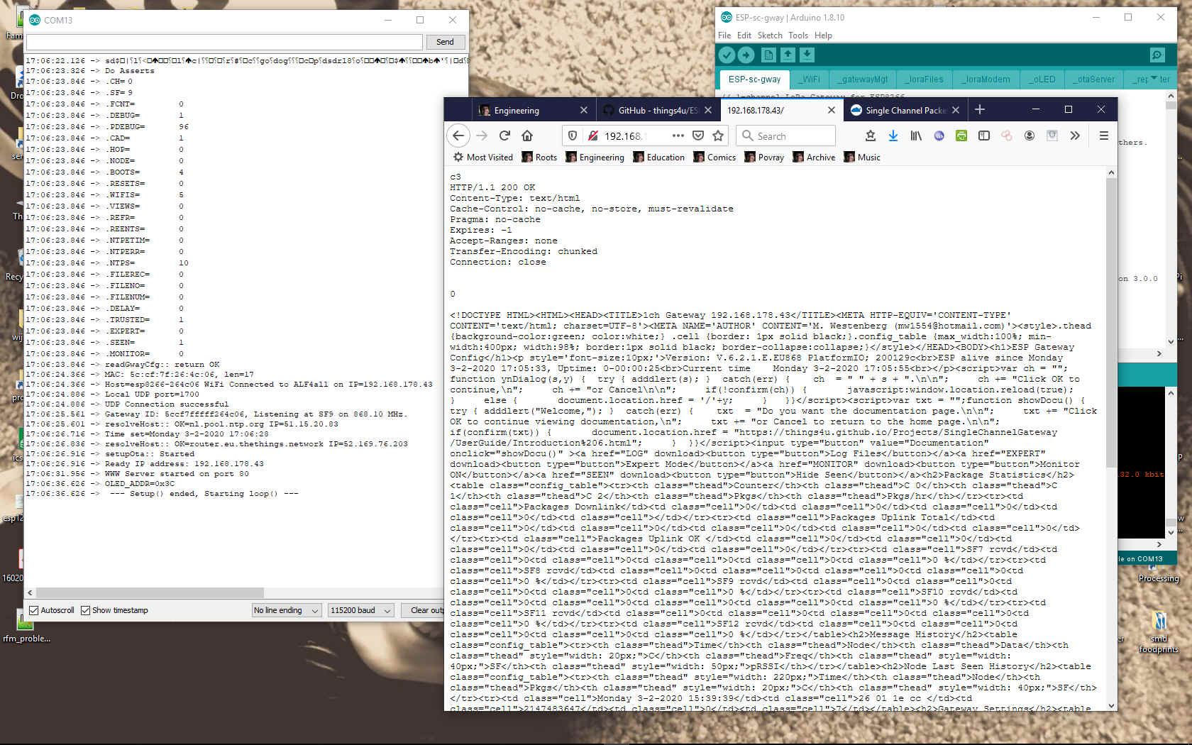 As end node it works perfect. Next step is to use it as single channel packet forwarder conform de software of Maarten Westenberg (6.2.0). After a lot reading, configurating and testing I came to the conclusion that the forwarder runs (not tested with end nodes yet) but the www-server gives me a lot ascii text in the browser (see next image)