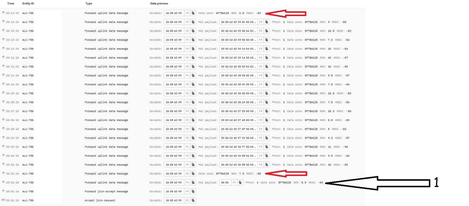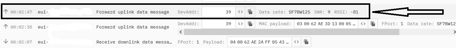 Then, from where i do not know, there is an uplink without payload just snr and rssi info and after 17 uplink messages that i am sending, again there is this unknown uplink (red arrows).