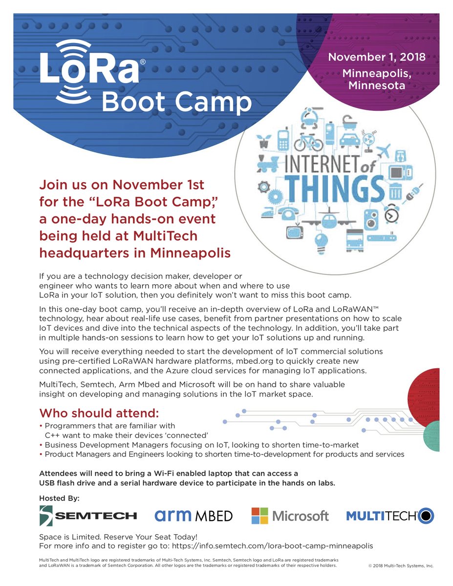 Come join me on November 1st in @CityMinneapolis for a #LoRa Bootcamp using @SemtechCorp modules running @ArmMbed #MbedOS connecting to @multitech gateways using @thethingsntwrk to send data to @MicrosoftIoT.