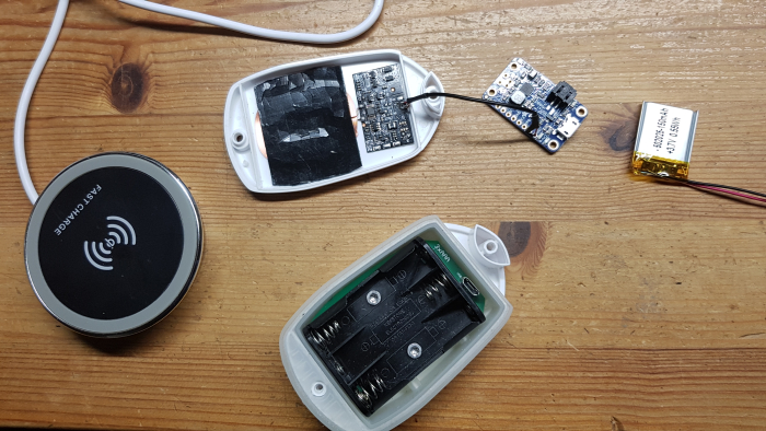 I had this idea already for a long time, collected the parts some time ago and yesterday night I came to the point where I actually did it: I started replacing the existing battery holder of a The Things Node for a LiPo and a DIY Qi wireless charger: