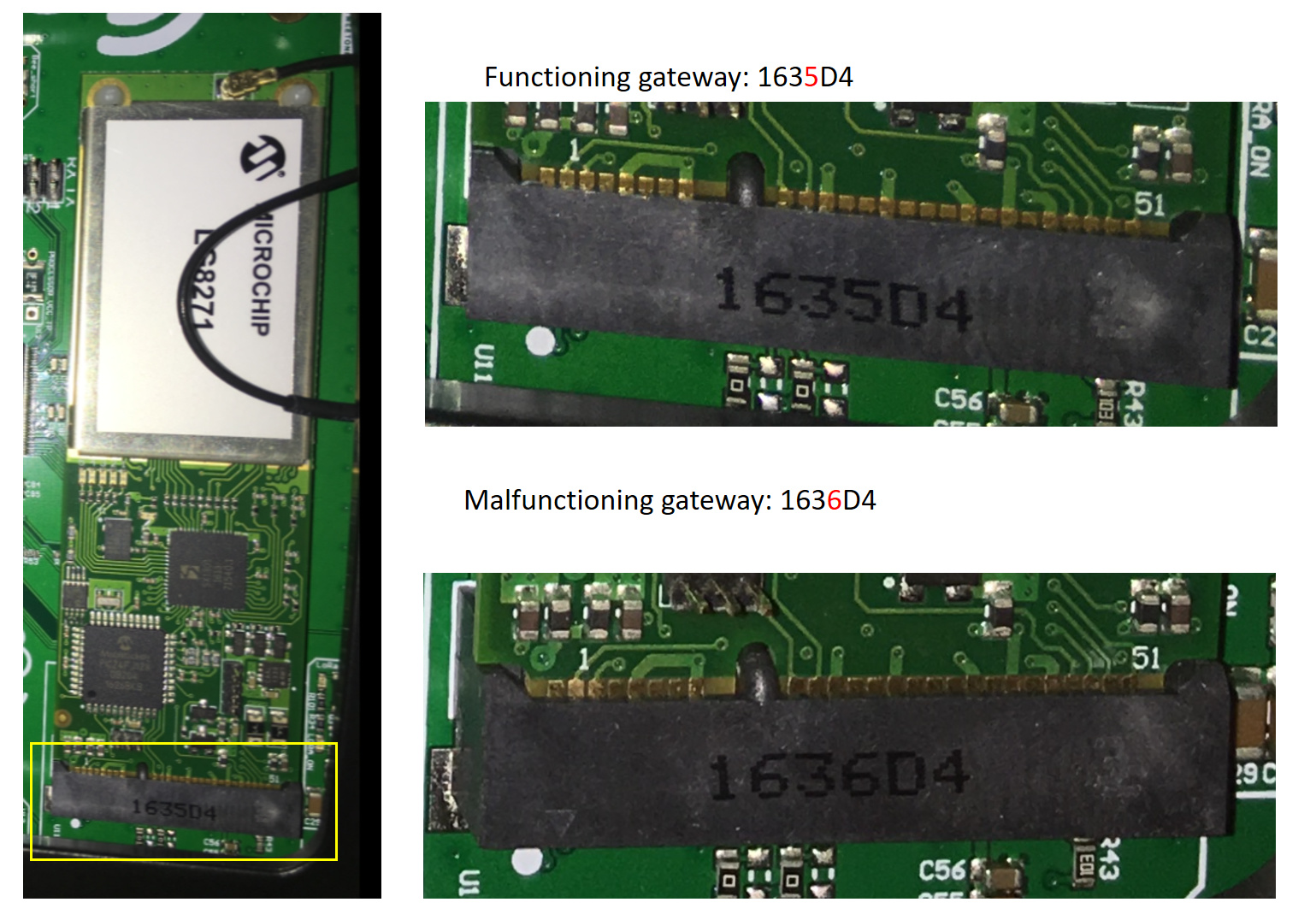 Also, as I have a working gateway AND a malfunctioning gateway, I am wondering if the following difference is relevant: the socket for the LoRa modem of the working gateway has a number etched on it: 1635D4, whereas the socket for the LoRa modem of the malfunctioning gateway has a different number: 1636D4. Can anyone compare this with his own gateway?