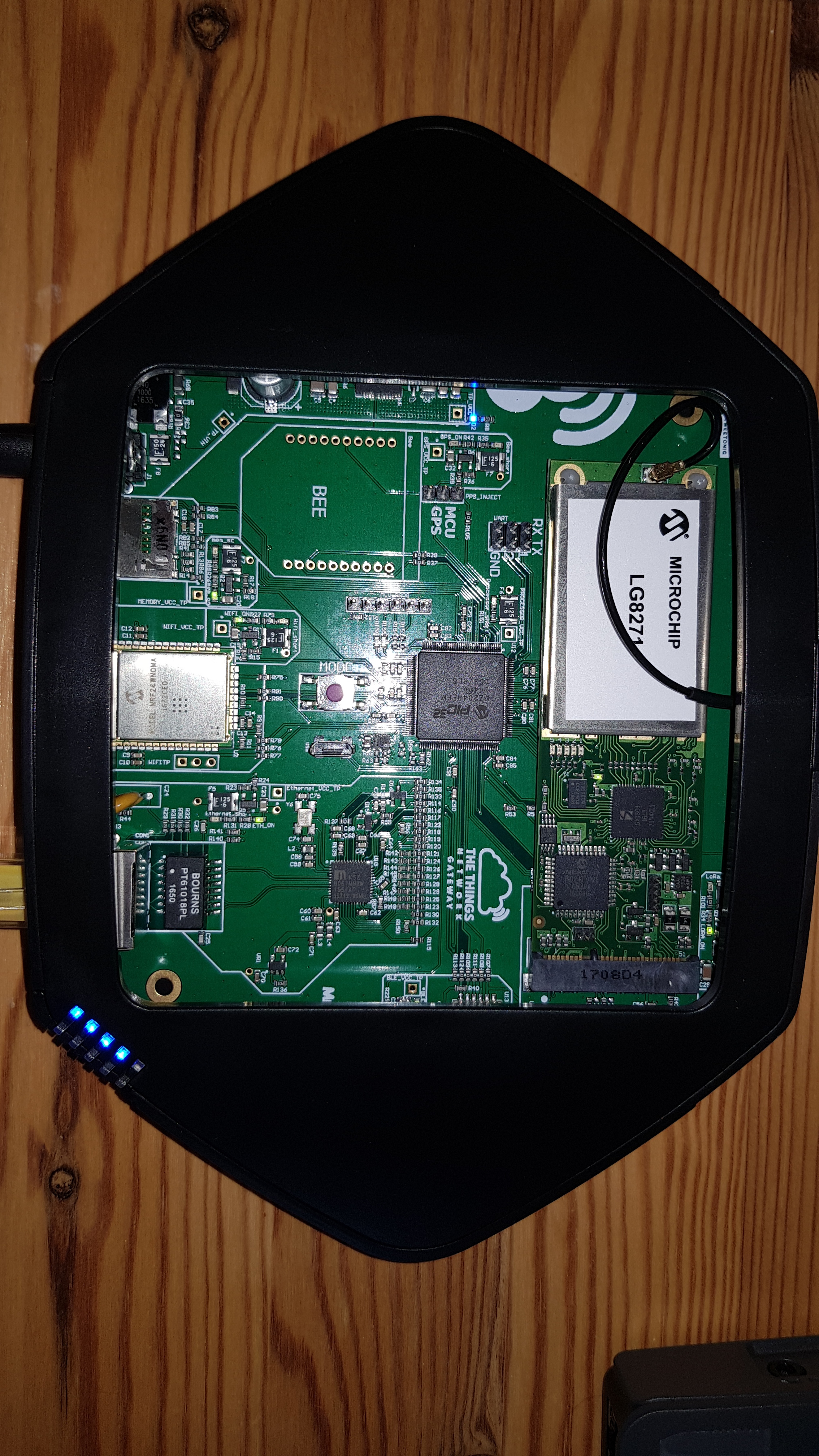 The LoRa board is fitted under a bit of stress in the 1636D4 socket. The plastic pins connecting it to the mainboard pull it down, bending the board it seems. I was planning to reseat the board, but noticed that it involves removing the antenna connector first as it is in the way when taking out the LoRa board. That and the fact that the board seems to be fitted a bit awkwardly made me think twice, so I got a cup of coffee instead