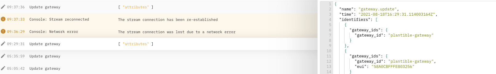 The “update gateway” events come from the Identity Server (in the eu1 cluster). Other gateway events should come from routing clusters. If your routing cluster isn’t eu1, it’s possible that you’ve opened the console of the wrong cluster, or that your gateway is trying to connect to the wrong cluster.