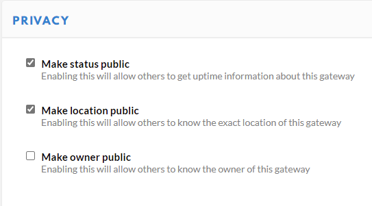 For TTN community connected GW’s default should be status & location public, though I can understand that with e.g EU GDPR owner may now have to be opt-in vs opt out (but not neccessarily in other parts of the world?) - though sure should be there to opt in to as an enabler for community communication and info exchange and also to request help in debugging and checking coverage etc…